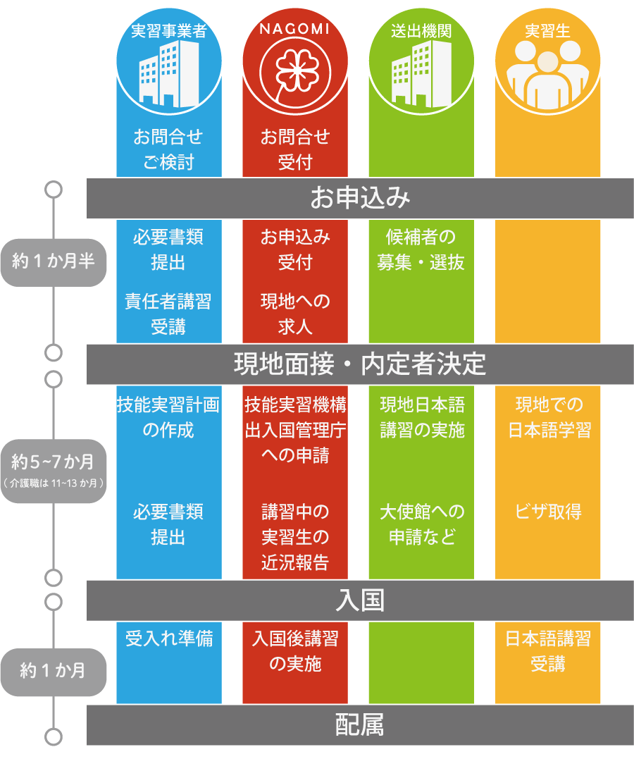 実習事業者へ配属されるまでにどのようなことが行われているのか、実習事業者・NAGOMI(監理団体)・送出機関・実習生のそれぞれの目線からご紹介。